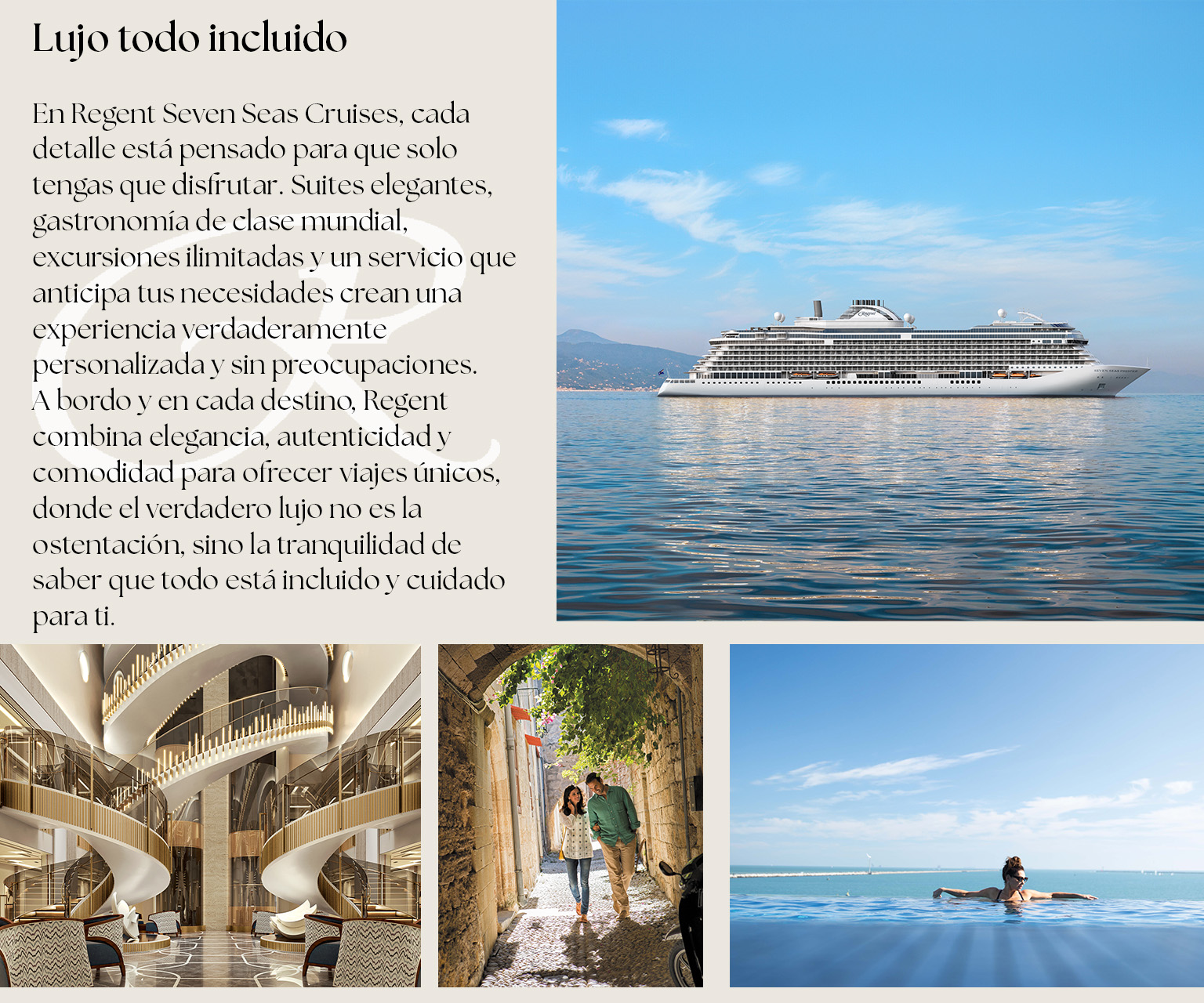 En Regent Seven Seas Cruises y Tempo Reps, cada detalle está pensado para que solo tengas que difrutar, donde el verdadero lujo no es la ostentación, sino la tranquilidad de saber que todo está incluido.